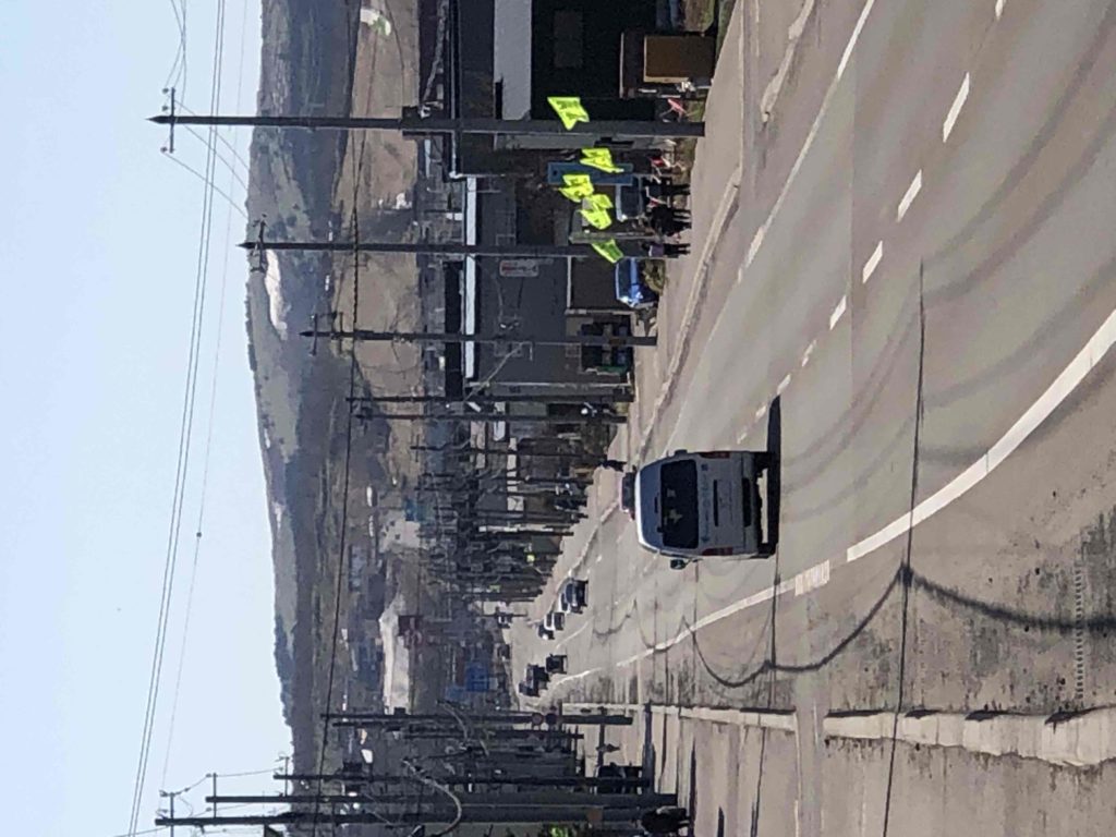 道路脇に立っている交通安全の旗は